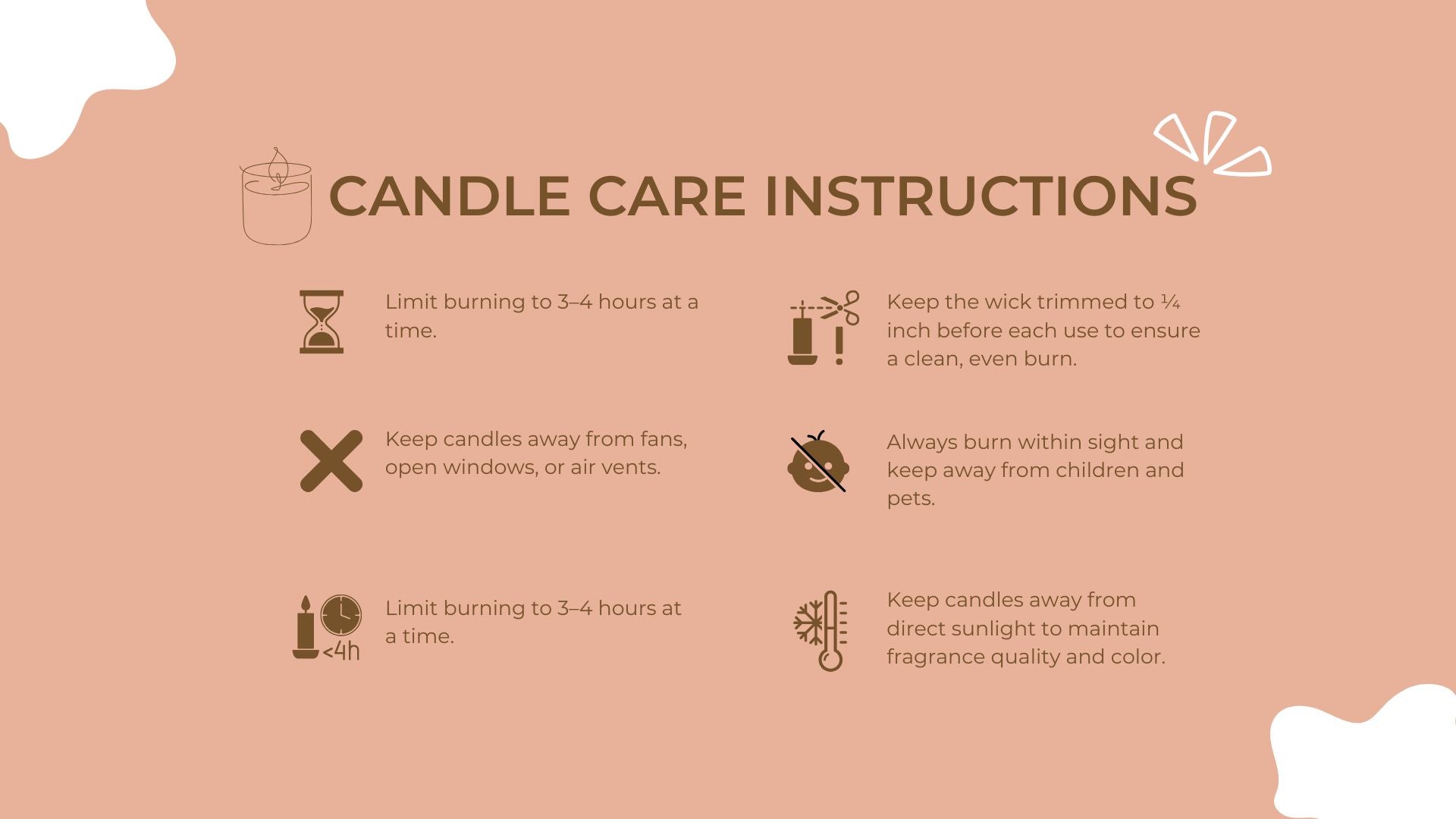 Our candles are made with 100% pure soy wax β a natural, renewable, and biodegradable alternative to traditional paraffin. Soy wax burns cleaner, lasts longer, and holds fragrance beautifully without emitting harmful toxins. Itβs a safer choice for you, your loved ones, and the planet.