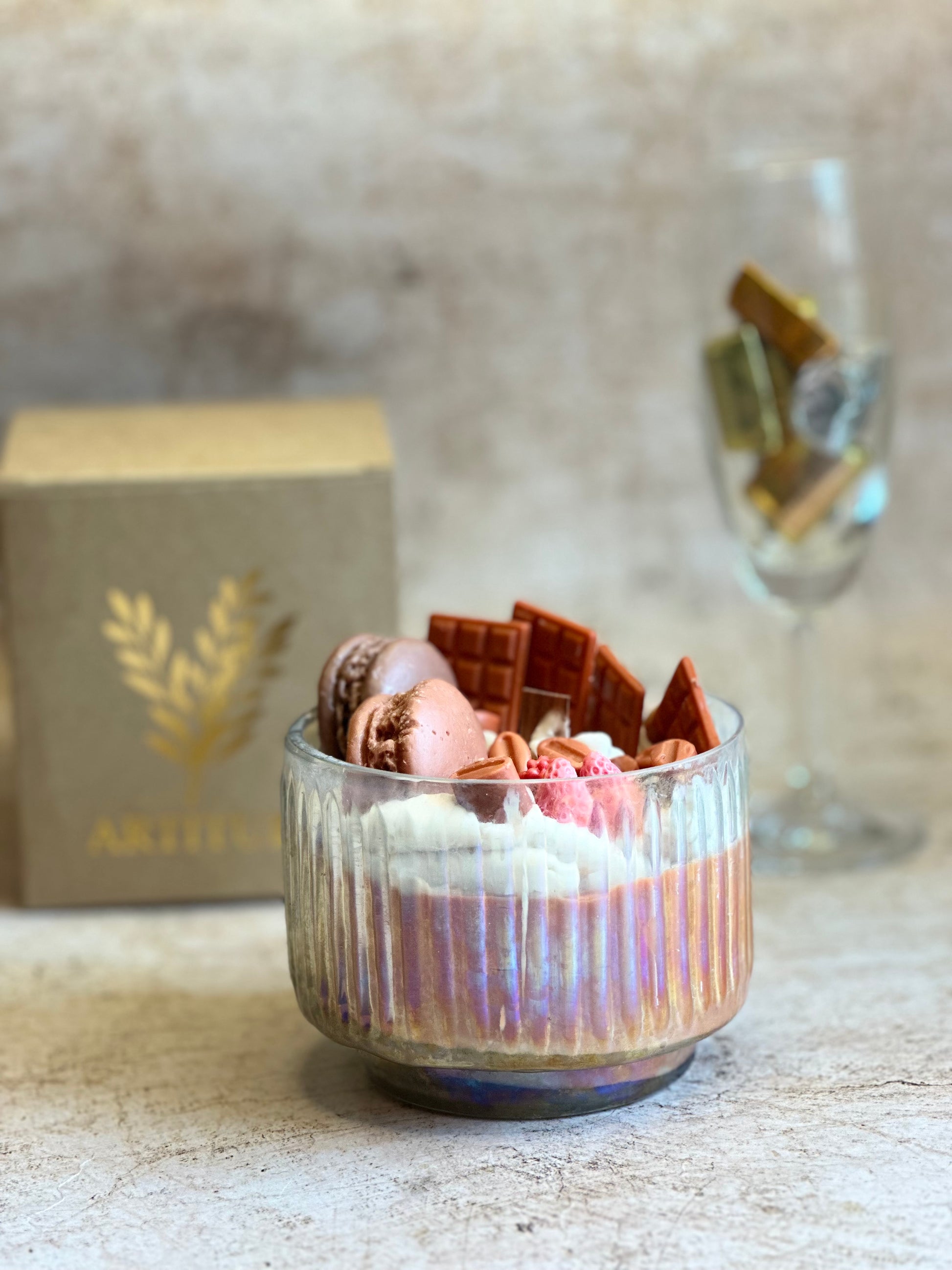 Discover the whimsical charm of Artitude's "Gourmet Glow" Dessert Candle, where artistry meets aromatherapy. This enchanting candle is a visual delight, expertly designed to mimic a gourmet dessert, complete with intricately placed macarons, luscious chocolate pieces, and a sprinkle of berries. It's an instant conversation starter and a perfect accent for those who appreciate both style and substance.